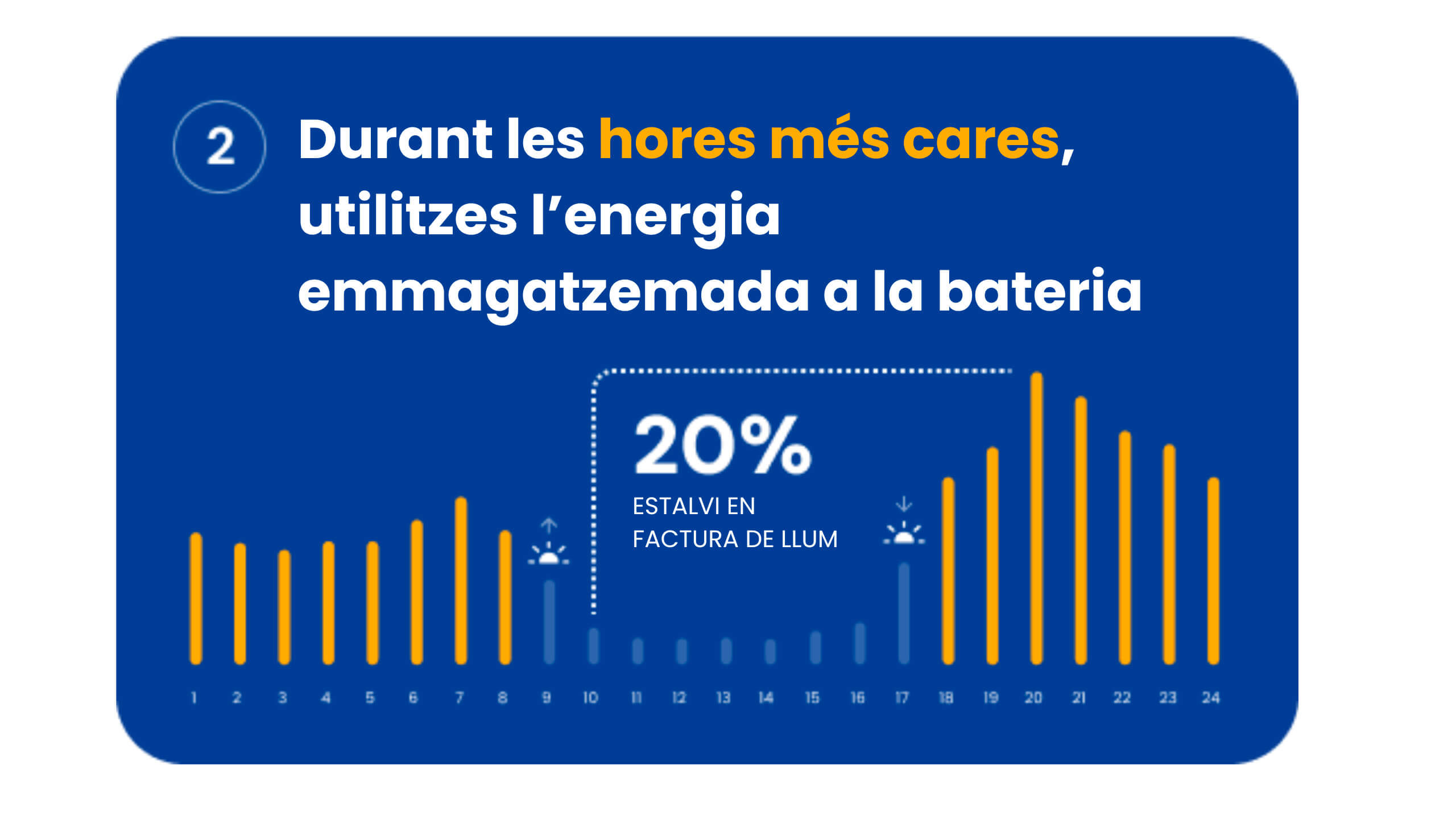 La nostra bateria intel·ligent emmagatzema energia durant les hores més barates —per exemple, durant les hores de sol o els períodes de menor demanda— i la fa servir automàticament quan més la necessites, com en el torn de sopars o en els moments de màxim consum.
